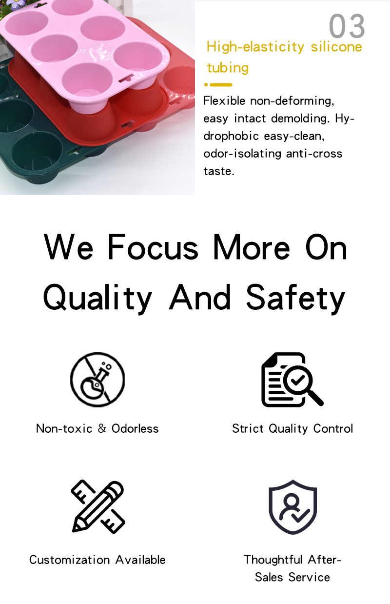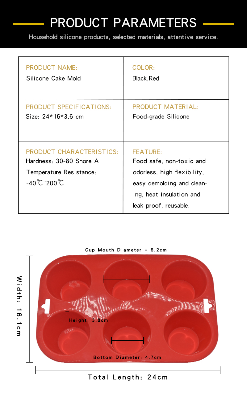 This 6-cavity silicone cake mold is integrally molded and vulcanized from premium food-grade silicone. Integrated molding without splicing gaps, with smooth and neat cavity structure and rounded edges. Support customized hardness from 30° to 80°, and customizable color matching. Strict quality inspection ensures stable structure and long service life.