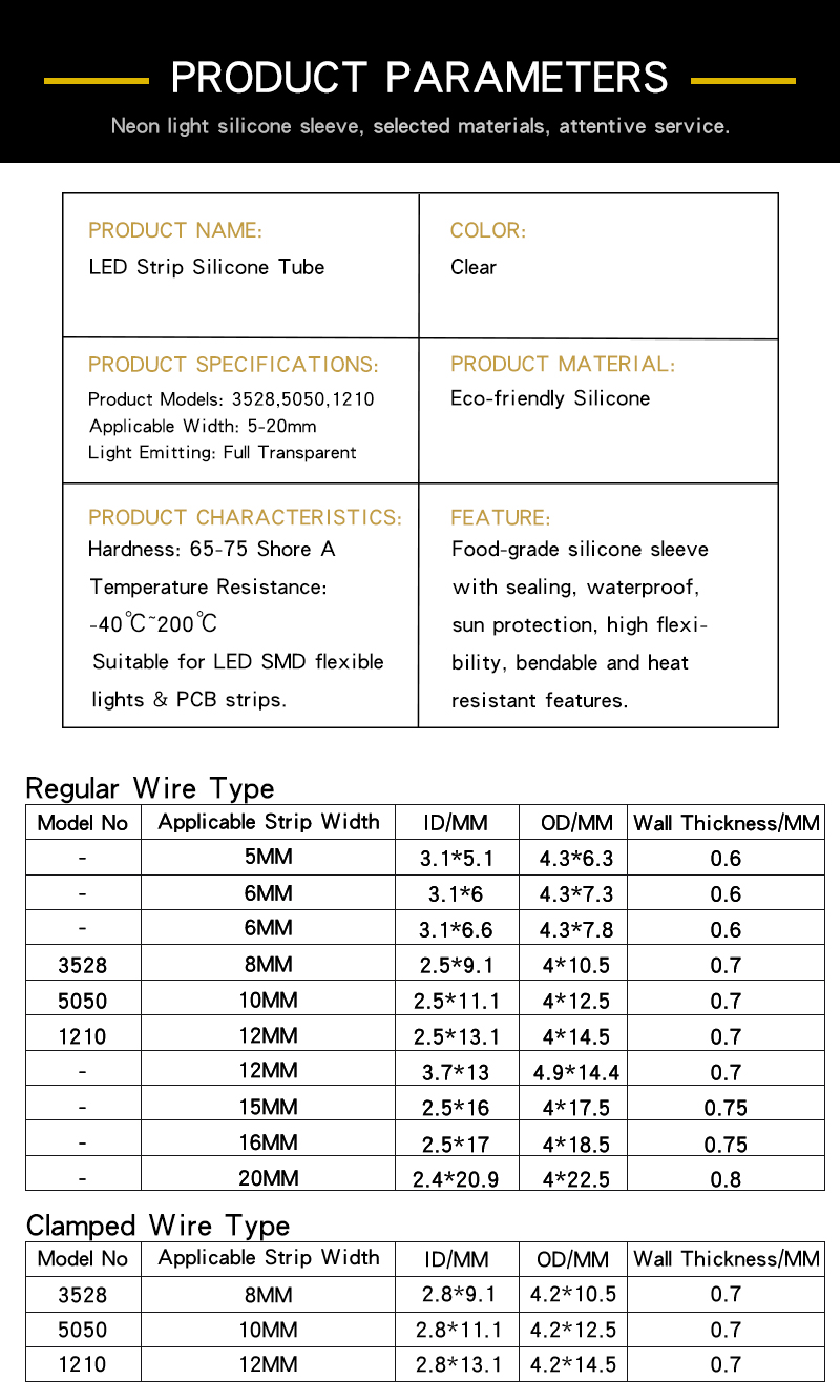 Our LED transparent silicone tube is manufactured from high-purity eco-friendly silicone raw materials, adopting integrated precision extrusion molding and stable platinum vulcanization process. The whole product is formed with seamless integrated structure, with uniform wall thickness, smooth surface and no bubbles or impurities. We provide full size specifications from 5mm to 20mm, which perfectly adapt to mainstream low-voltage flexible LED strip lights. Two optional structural styles (regular wire type and clamped wire type) are available, with stable and consistent molding quality in every batch to ensure perfect matching with LED strips.