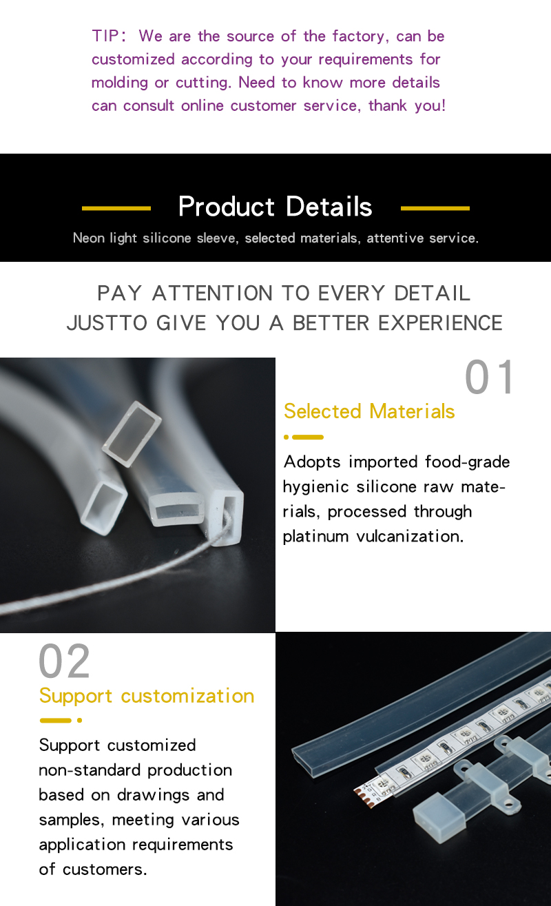 Equipped with high-transparency light-transmitting structure, this silicone sleeve achieves high light transmittance and uniform light output with no light loss or dark shadows. It owns excellent airtight sealing performance, full waterproof and dustproof properties to effectively protect internal LED circuits from water erosion. With standard 70±5 Shore A hardness, it features outstanding flexibility and free bendability, supporting arbitrary cutting and splicing without cracking or deformation after repeated bending. Supported by ultra-wide temperature resistance from -40℃ to 220℃, it maintains stable performance in extreme cold and high-temperature environments, with superior UV resistance, anti-yellowing and aging resistance for long service life.