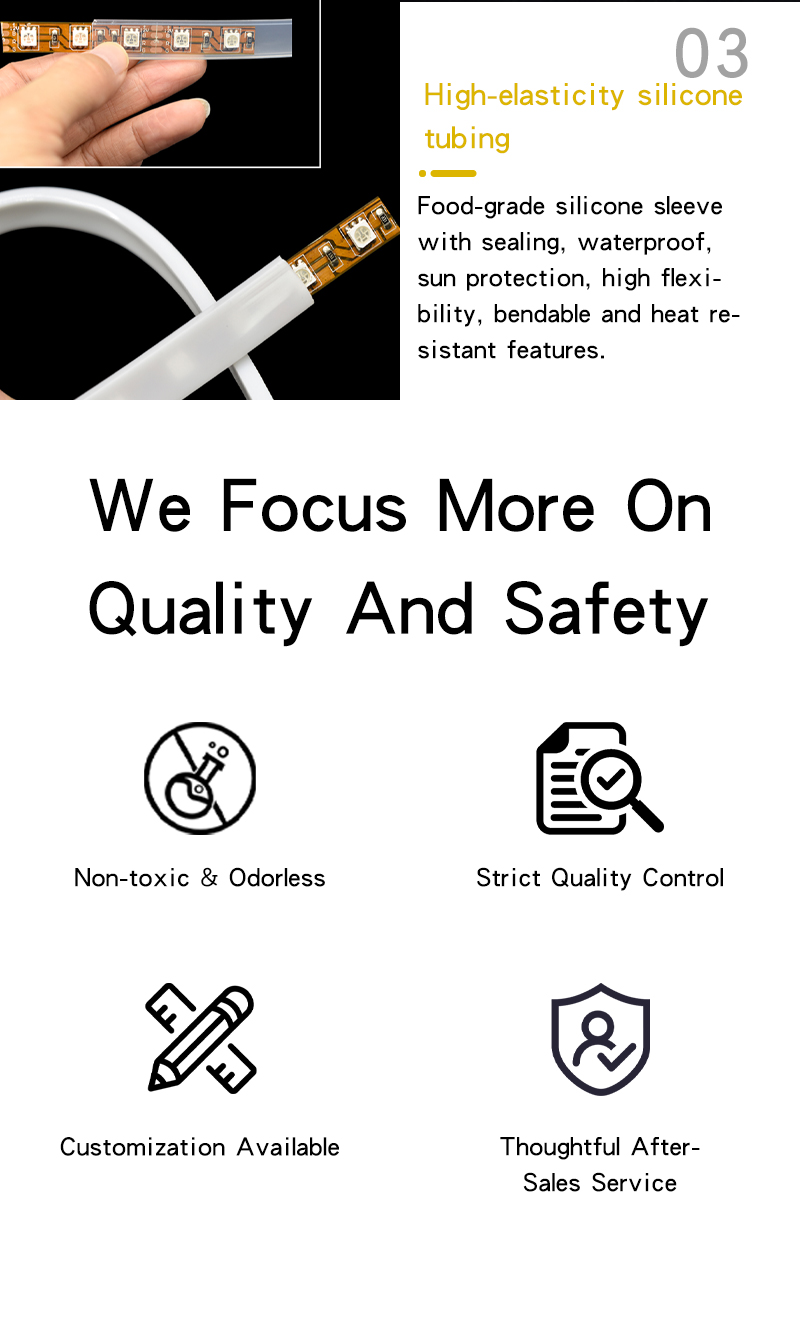 With outstanding environmental adaptability, our LED transparent silicone tube is suitable for both indoor and outdoor large-scale engineering projects. It is widely applied to diversified scenarios including home decoration, commercial spaces, architectural landscapes and vehicle decoration. It serves as an ideal protective casing solution for LED strip lights, custom neon sign making, commercial advertising lighting, architectural outline decoration, home atmosphere lighting (cabinet lights, corridor lights) and all embedded protection of LED SMD PCB strip light projects.