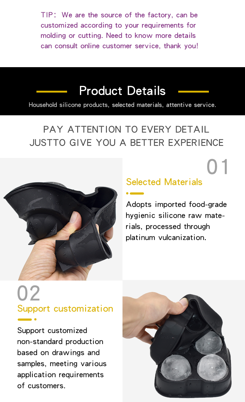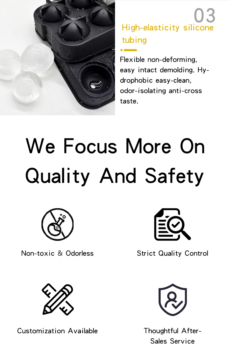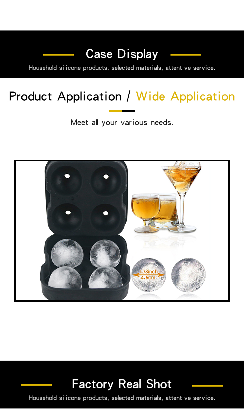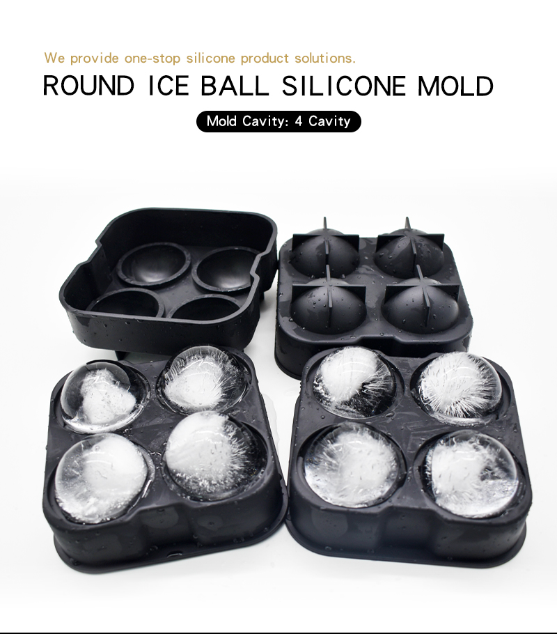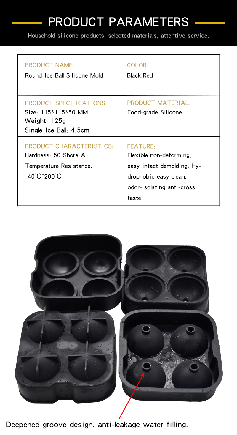 This 4-cavity round ice ball silicone mold is integrally compression molded from premium food-grade silicone with mature vulcanization process. It features thick and solid silicone body, neat and smooth spherical cavity, great overall toughness. Resistant to deformation after repeated bending and stretching. Available in black and red colors, with stable physical properties and long reusable service life after strict quality inspection.