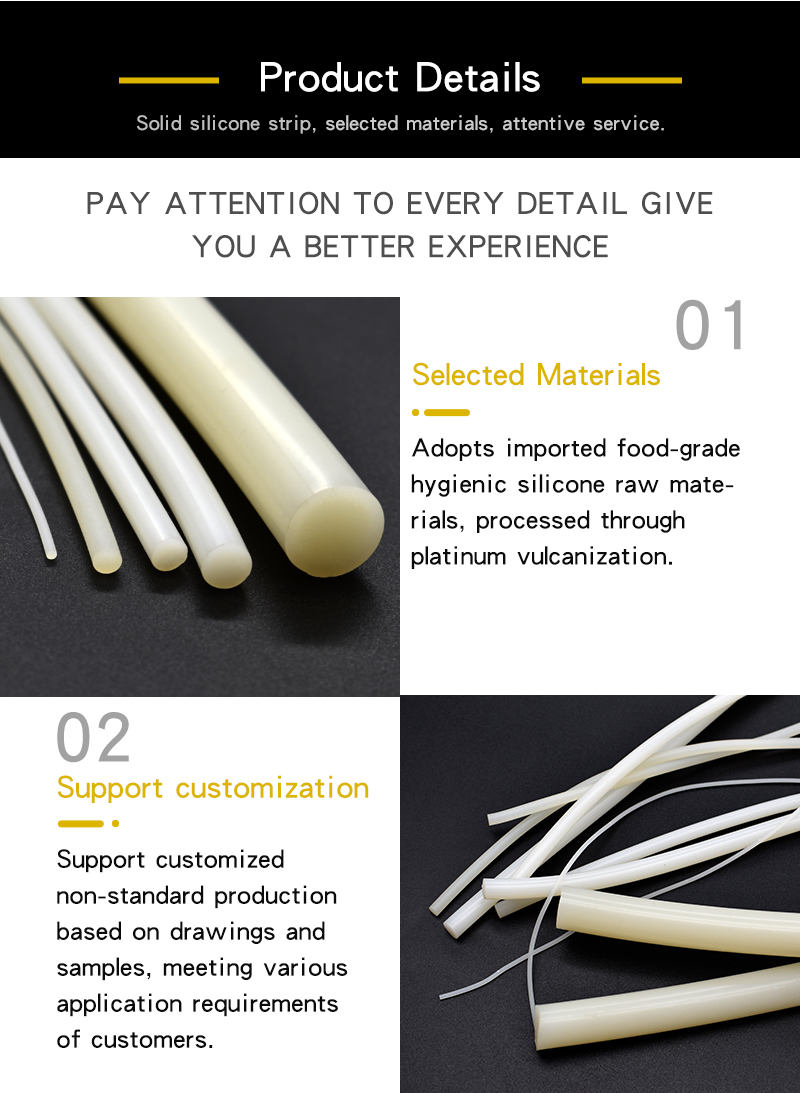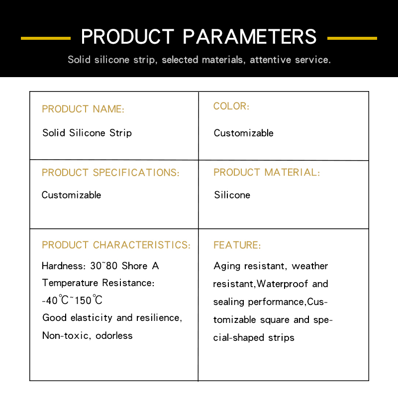 Features:High-Temperature Resistant Seal Strip:Excellent resistance to high and low temperatures, ozone and atmospheric aging.Also with good dielectric properties, water repellency and physiological inertness.Mainly used in machinery and other sealing parts with high requirements.Operating temperature: -40°C to 150°C