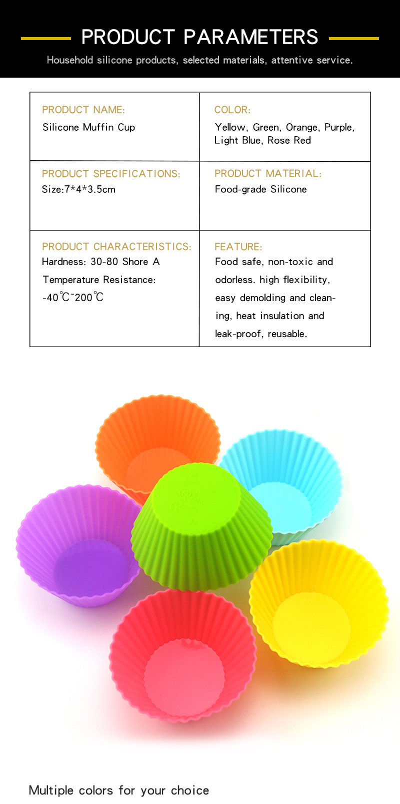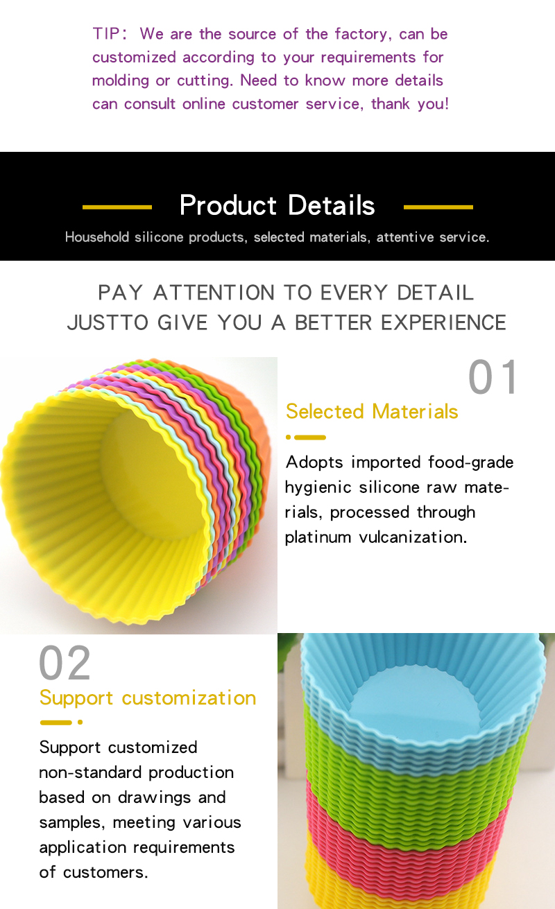 Made of food-grade silicone via integrated vulcanization molding. One-piece cup structure without splicing gaps, with fine ribbed wall and smooth edge. Supports customizable hardness from 30° to 80°. 6 standard colors available (Yellow, Green, Orange, Purple, Light Blue, Rose Red) and custom color service. Passed strict food contact safety inspection for long-term reuse.