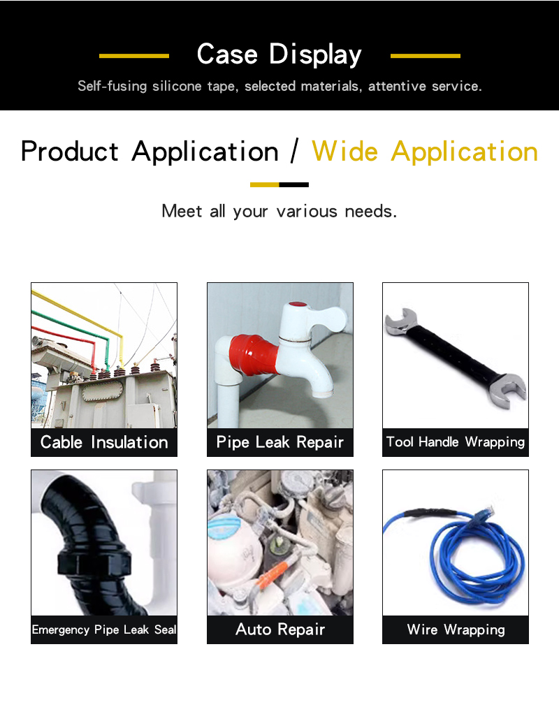 A: It is suitable for cable insulation, wire wrapping, pipe leak repair, tool wrapping, auto repair and other scenarios, covering industrial, household and automotive fields.