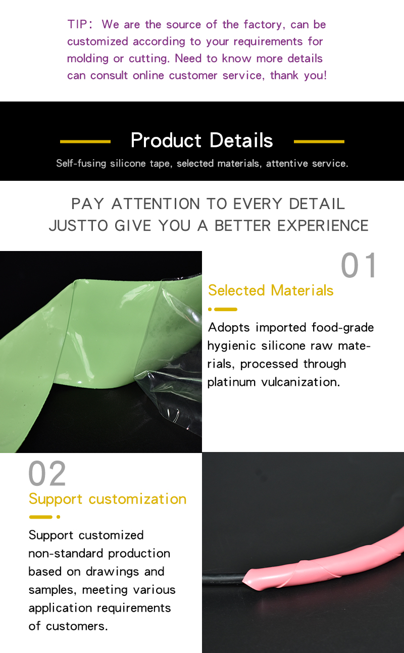 This silicone self-fusing tape features safety, practicality and durability. It is eco-friendly, RoHS/REACH certified, non-toxic and odorless. With optimized self-fusing and self-adhesive design, it achieves tight wrapping and permanent sealing, and withstands -60℃ to 180℃ (short-term up to 260℃, suitable for high-temperature and low-temperature environments). It is tensile-resistant, anti-aging, anti-UV, easy to use without residue, and supports color, size and thickness customization for diverse application needs.