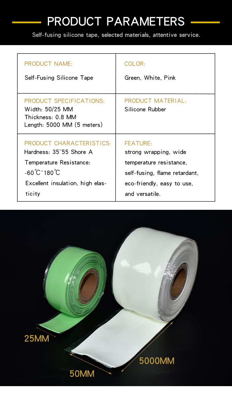 The Silicone Self-Fusing Tape is widely used for various scenarios such as cable insulation, wire wrapping, pipe leak repair, pipe emergency leak stopping, tool wrapping and auto repair, covering electrical equipment, industrial pipelines, household maintenance and automotive maintenance. It also applies to special environments such as ships, oil fields and outdoor engineering, and provides OEM/ODM customization services for industrial and electrical manufacturers to enhance product protection performance.