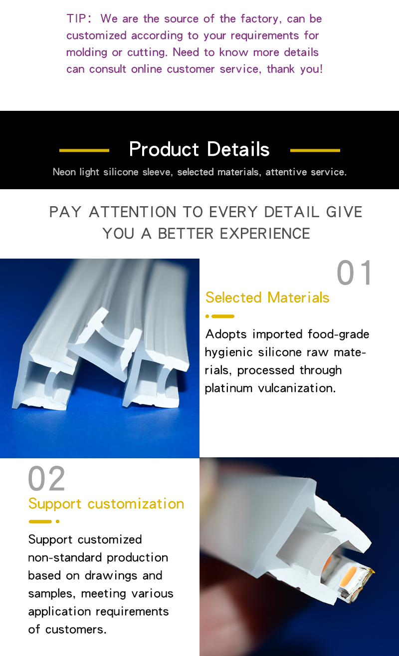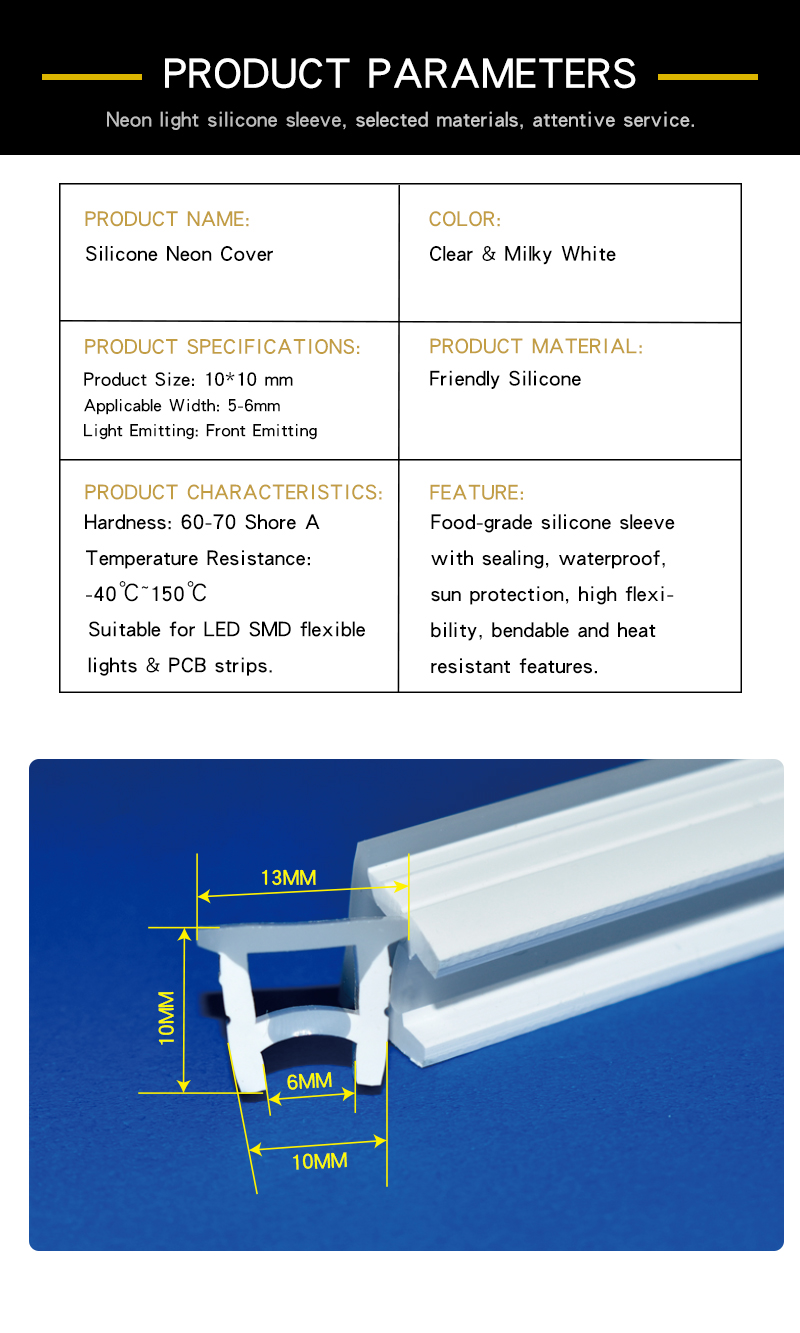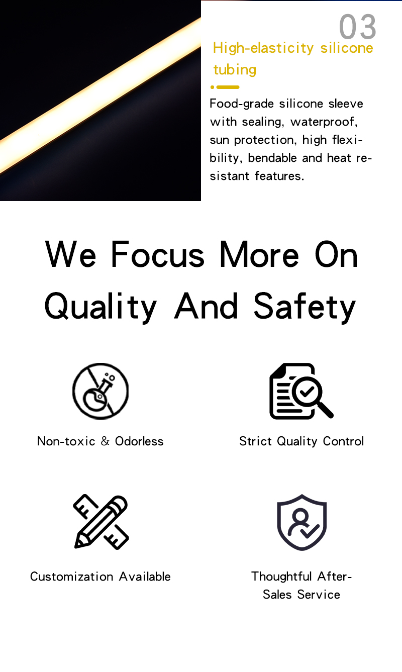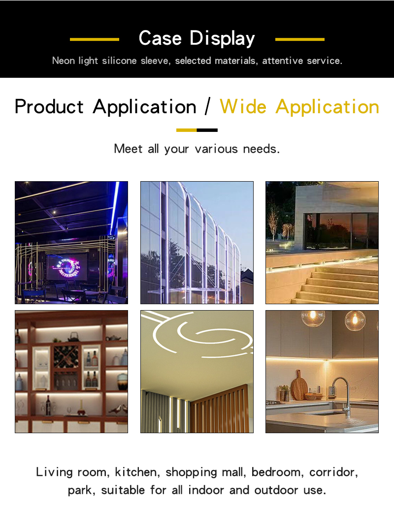 With outstanding environmental adaptability, our silicone tube is suitable for both indoor and outdoor large-scale engineering projects. It is widely applied to diversified scenarios including living rooms, kitchens, bedrooms, corridors, shopping malls and parks. It serves as an ideal protective casing solution for custom neon sign making, commercial advertising lighting, architectural outline decoration, home atmosphere lighting and all embedded protection of LED SMD PCB strip light projects.