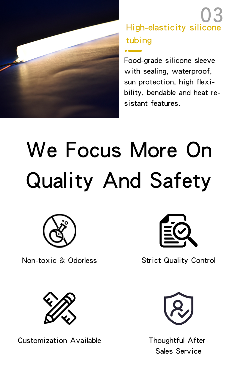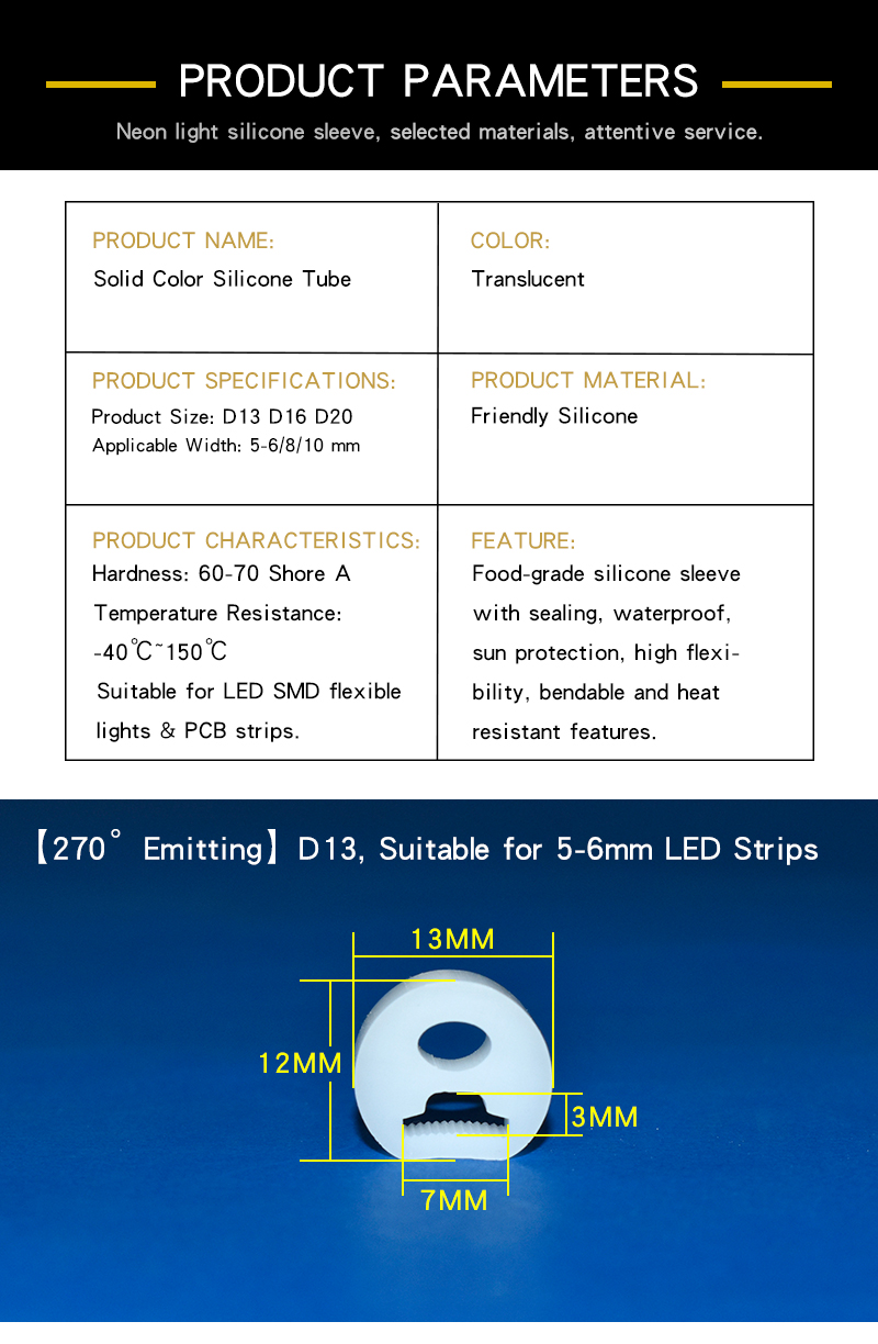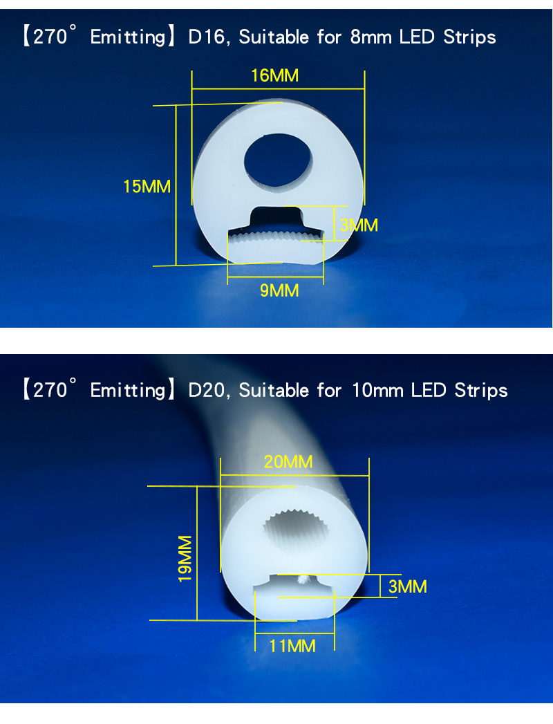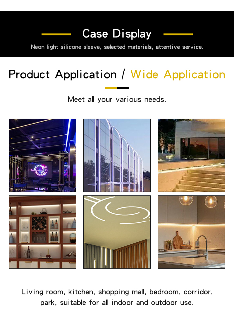 A:They are flexible silicone casings for LED strip lights, used for protection, light diffusion, and decoration. Widely applied in outdoor lighting, signboards, architectural lighting, and custom neon projects.